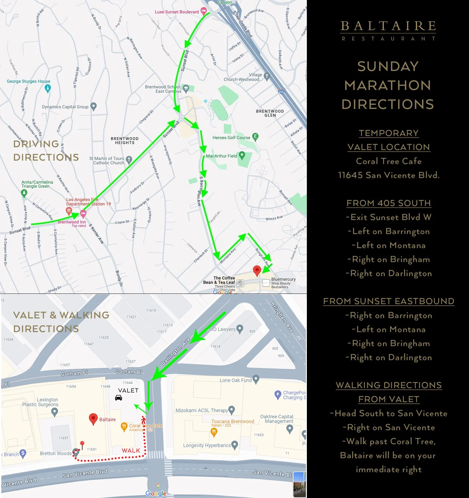 To help you navigate the closures, we’ve provided a detailed map (see below) showing the easiest route to Baltaire and our temporary valet location at Coral Tree Café.
